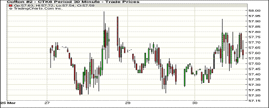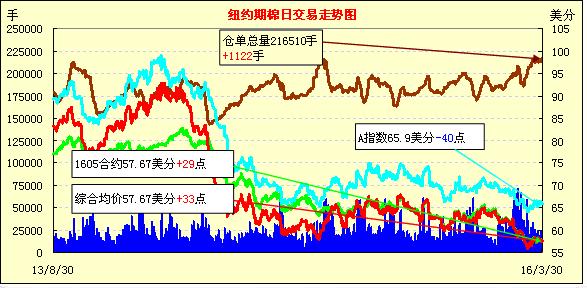 市場關注即將發(fā)布的USDA種植報告,周三紐約期棉小幅收漲;1605月合約57.67美分/磅,漲29點;1607月合約57.72美分/磅,漲43點。當日主力合約開盤后走勢保持平穩(wěn),最高價57.92美分/磅,期間合約價兩次沖高,但波動幅度較小。即將發(fā)布的USDA種植面積報告使市場保持觀望,同時中國拋儲細節(jié)遲遲不公布也增加的投資者對市場的擔憂。