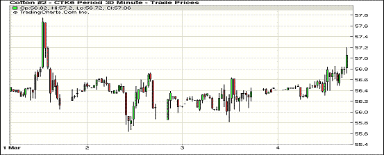 3月4日,紐約期棉延續(xù)反彈趨勢(shì),合約價(jià)收漲;1605月合約57.11美分/磅,漲70點(diǎn);1607月合約56.71美分/磅,漲55點(diǎn)。當(dāng)日主力合約小幅上漲,震蕩區(qū)間擴(kuò)大,本周1605合約合計(jì)上漲61點(diǎn)。據(jù)考特魯克預(yù)測(cè),2016/17年度世界棉花產(chǎn)量較本年度增8%,至2274.8萬噸,但低于2014/15年度產(chǎn)量,消費(fèi)僅上漲1.4%。