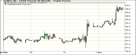 4月1日,紐約期棉連續(xù)三個交易日收漲,成交活躍。近期5月合約結(jié)算價59.20美分/磅,漲76點,達(dá)到自2月22日以來的高位。市場依然不顧USDA面積報告利空,繼續(xù)炒作天氣因素促使市場進一步走高。5月合約上半場交易主要在58-58.5美分/磅之間波動,交易中期拔高至59美分以上,觸發(fā)止損買單后市場得以在高位盤整,最終收于近高點。美國三角洲出現(xiàn)持續(xù)降雨,市場炒作天氣,對盤面形成支持。