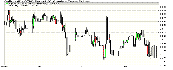 5月12日紐約期棉行情相對穩(wěn)定,7月合約結(jié)算價60.37美分/磅,漲13點,12月合約60.57美分,跌1點。當(dāng)日7月合約早盤上漲,交易中期行情疲軟,到交易后期維持在日高區(qū)間波動,最終以止跌收盤。據(jù)美國農(nóng)業(yè)部(USDA),上周美陸地棉凈簽約出口量2.3萬噸,較前一周增加69%,較近四周平均增加38%。