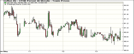 5月13日紐約期棉市場窄幅波動,成交量平穩(wěn),7月合約結(jié)算價60.62美分/磅,跌11點,12月合約60.51美分,跌6點。當日7月合約整日交易波動較小,日區(qū)間波動幅度終多數(shù)合約以微幅下跌收盤。分析師指出,近日ICE期棉市場缺乏動能表現(xiàn)平淡,北半球新花生長整體正常產(chǎn)量預期提升有壓于市場,但中國儲備棉輪出成交量居高對市場構成支撐。