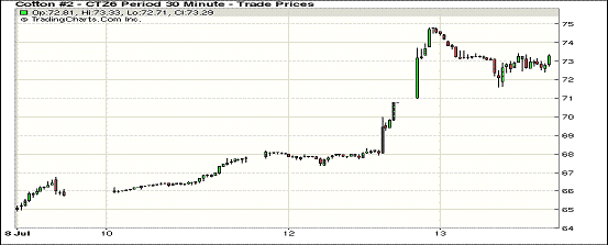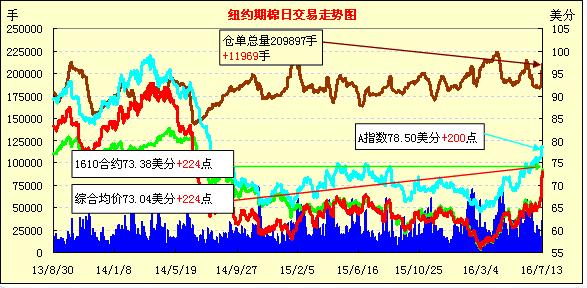 周三商品市場(chǎng)整體不振,CRB指數(shù)下跌,但紐約期棉繼續(xù)強(qiáng)勢(shì)上漲。1610合約73.38美分/磅,漲224點(diǎn);1612合約73.15美分/磅,漲237點(diǎn)。當(dāng)日主力合約在交易早間長(zhǎng)勢(shì)較強(qiáng),最高達(dá)到74.78美分/磅,之后合約回落,但投機(jī)性買盤不斷介入,棉價(jià)得到有力支撐因此收于震蕩區(qū)間中部。因7月USDA預(yù)測(cè)報(bào)告大幅調(diào)整,紐約期棉13日繼續(xù)上漲,達(dá)到2014年9月12日以來(lái)最高收盤價(jià)。貿(mào)易商表示目前中國(guó)強(qiáng)勁的需求體現(xiàn)在不斷上漲的拍儲(chǔ)輪出價(jià)格和較高的成交率,并對(duì)前景持樂觀態(tài)度。