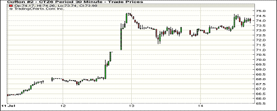 7月1-7日美棉簽約出口較前周減少,但紐約期棉繼續(xù)上漲,不斷創(chuàng)下新高。1610合約73.82美分/磅,漲44點;1612合約73.87美分/磅,漲72點。當日紐約期棉開盤后呈下跌走勢,但持續(xù)時間不長。12月合約在中午上漲,最高價74.67美分/磅,合約最終收于震蕩區(qū)間高位。至7月7日,2015/16年度美棉出口累計已達到預測出口量的106%,裝運92%,2016/17年度美棉出口達到世界棉花貿(mào)易的33.5%,為近6個年度以來最高。
