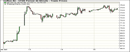 周五紐約期棉連續(xù)第六日上漲,12月合約本周累計(jì)上漲847點(diǎn),漲幅13%。1610合約73.86美分/磅,漲4點(diǎn);1612合約74.28美分/磅,漲41點(diǎn)。當(dāng)日紐約期棉開盤后平穩(wěn)上漲,合約價(jià)在75美分一線遇到阻力,合約走勢缺乏方向并小幅震蕩,但收盤再次得到支撐上漲。本周不僅USDA預(yù)測下調(diào)印度產(chǎn)量,印度棉花咨詢董事會(CAB)也將印度產(chǎn)量下調(diào)至3380萬包,較其2月的預(yù)測下調(diào)109萬包。