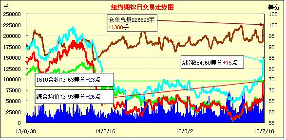在連續(xù)上漲六個交易日后,主力合約周一下跌,其他合約漲跌互現(xiàn)。1610合約73.63美分/磅,減23點(diǎn);1612合約73.95美分/磅,跌33點(diǎn)。周一12月合約在早間交易上漲,在74.95美分/磅遭遇阻力,之后走勢保持低迷,收盤前買盤支撐合約價上漲。至本周,美棉苗情保持良好,新花正常的比例在90%(優(yōu)秀9%,良好45%,一般36%),9%較差和1%極差;新花坐果28%。