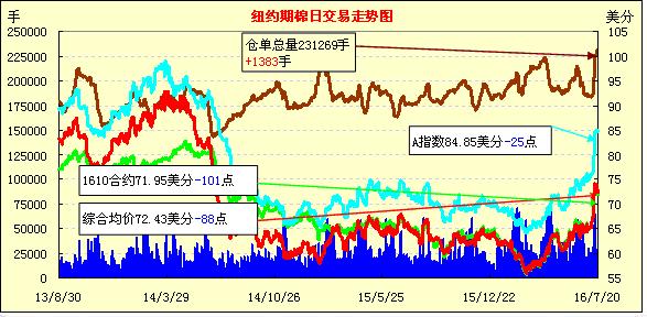 周三美元指數(shù)小幅上漲,鄭棉大跌,紐約期棉延續(xù)跌勢,合約價下跌53到101點不等;1610月合約收于71.95美分/磅,跌101點;1612月合約收于72.35美分/磅,跌95點。當(dāng)日主力12月合約全天在跌幅區(qū)間,賣盤帶來較大壓力但買盤處于觀望,最低價跌至71.76美分/磅,為本周最低。受偏緊的供應(yīng)影響,上周紐約期棉暴漲,本周期棉回到調(diào)整格局,但總體有限的供應(yīng)不變,短期內(nèi)期棉下跌幅度有限。