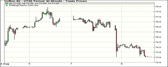 周二紐約期棉暴跌并觸發(fā)跌停限制,創(chuàng)近一年來最大跌幅;1612月合約收于73.05美分/磅,跌300點;1612月合約收于73.54美分/磅,跌300點。周一晚間德州棉區(qū)降雨,同時中國官方確認拋儲延期,鄭棉期貨大幅走弱,周二紐約期棉賣盤壓力較大,開盤后暴跌并最終以-300點跌停。據(jù)印度官方最新報告,至8月5日印度種植面積964.80萬公頃,較去年同期落后9%,古吉拉特降雨不斷增加,同時德州天氣干旱預(yù)測繼續(xù)緩解,紐約期棉可能繼續(xù)回落。