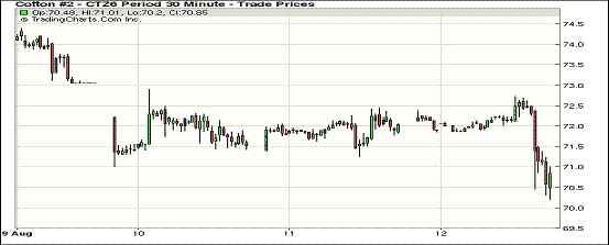 受美國農(nóng)業(yè)部(USDA)報(bào)告利空影響,8月12日紐約期棉市場(chǎng)大幅下跌,近期10月合約結(jié)算價(jià)69.88美分/磅,跌139點(diǎn),主力12月合約結(jié)算價(jià)70.65美分/磅,跌121點(diǎn)。在USDA報(bào)告發(fā)布前,市場(chǎng)在72-73美分一線區(qū)間震蕩,報(bào)告發(fā)布后顯示利空,市場(chǎng)成交量增加交易活躍度上升,行情整體呈向下趨勢(shì),最終在70美分處獲得支撐,以略高于支撐位收盤。USDA報(bào)告中未調(diào)整美棉種植面積,單產(chǎn)略有上調(diào),因此美棉總產(chǎn)稍有調(diào)高,并未如市場(chǎng)預(yù)期德州干旱而調(diào)低產(chǎn)量;市場(chǎng)此前預(yù)期印度可能產(chǎn)量大幅度被調(diào)低,但調(diào)整幅度并不大,低于預(yù)期情況下市場(chǎng)整體下跌。外圍美元指數(shù)下跌,谷物期貨漲跌不一。