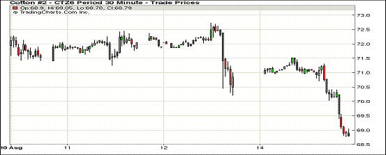 美國(guó)農(nóng)業(yè)部(USDA)報(bào)告利空影響延續(xù),周一紐約期棉市場(chǎng)連續(xù)以百點(diǎn)以上幅度下跌,全線跌破70美分/磅,近期10月合約結(jié)算價(jià)68.09美分/磅,跌179點(diǎn),主力12月合約結(jié)算價(jià)68.86美分/磅,跌179點(diǎn)。當(dāng)日市場(chǎng)小幅高開(kāi),主力合約早盤(pán)徘徊于70美分以上,后因賣(mài)盤(pán)打壓連續(xù)跌破70美分和69美分,回到7月中旬啟動(dòng)大漲之際的水平。USDA報(bào)告中意外調(diào)高美棉產(chǎn)量,市場(chǎng)進(jìn)一步消化利空。