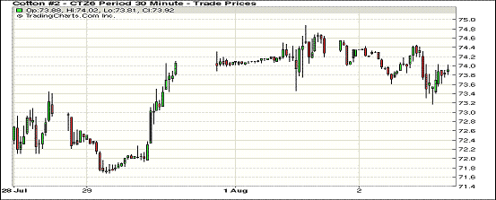 8月2日,商品價(jià)格整體走軟,美國(guó)棉區(qū)降雨緩解干旱,紐約期棉小幅下跌;1610月合約收于73.67美分/磅,跌50點(diǎn);1612月合約收于73.98美分/磅,跌40點(diǎn)。當(dāng)日1612合約早間上漲并很快達(dá)到當(dāng)日最高價(jià),之后合約遭遇阻力回落。 周二美國(guó)棉區(qū)天氣改善,上周起印度降雨也有增加,古吉拉特降雨較去年差距縮小,市場(chǎng)預(yù)測(cè)印度種植面積增加,投資者持觀望心態(tài)。