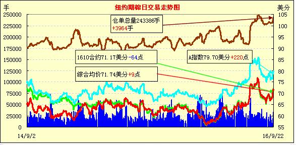 周四紐約期棉漲跌互現(xiàn),主力合約小幅收高;1612合約收于71.71美分/磅,漲9點;1703合約收于71.82美分/磅,漲9點。當日主力合約全天走勢震蕩,但最終收漲。主力合約連續(xù)四個交易日上漲,累計上漲443點。周四公布的美棉出口量較前周增加,但較近四周平均下降。截至目前美棉簽約已達USDA預計出口量的47%,去年同期為35%。