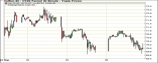 26日紐約期棉市場小幅漲跌,主力12月合約結(jié)算價70.08美分/磅,漲1點,1703月合約70.54美分,漲11點。早盤受中國鄭期市場大幅上漲刺激,紐約期棉12月合約早盤走高,最高觸及71美分,交易中期回落到70美分尋找支撐,終以與前一交易日基本持平收盤。雖然鄭棉市場飆漲,但美棉產(chǎn)量看增,市場缺乏炒作題材,表現(xiàn)相對平淡。