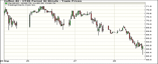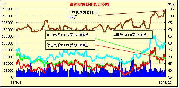 市場(chǎng)看空美棉出口,周三紐約期棉繼續(xù)下跌;1612合約收于68.48美分/磅,跌126點(diǎn);1703合約收于68.98美分/磅,跌126點(diǎn)。當(dāng)日早間主力12月合約窄幅震蕩,之后保持下行趨,并最終收于當(dāng)日交易區(qū)間底部。目前美國(guó)棉區(qū)采摘壓力較大,德州西部和東南棉區(qū)降雨緩解,天氣炒作因素對(duì)棉價(jià)不再形成影響。