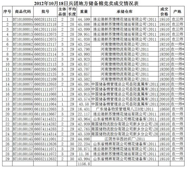 錦橋紡織網—資訊頻道> 棉花信息> 拋儲>正文 10月18日兵團棉花競賣成交結果