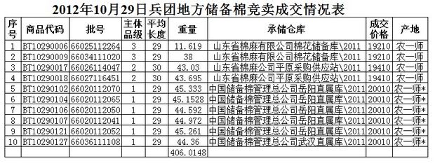 錦橋紡織網(wǎng)—資訊頻道> 棉花信息> 拋儲>正文 10月29日兵團(tuán)棉花競賣成交結(jié)果