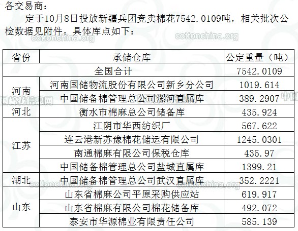 10月8日兵團(tuán)棉花競賣預(yù)告:計劃投放7542.0109噸
