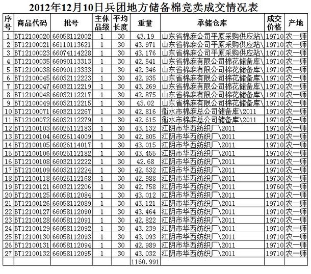 12月10日兵團棉花競賣成交結(jié)果