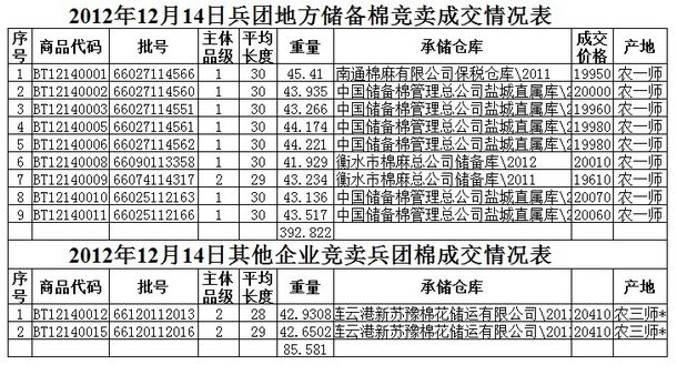 12月14日兵團(tuán)棉花競(jìng)賣成交結(jié)果