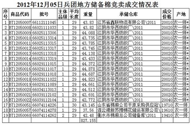 12月5日兵團(tuán)棉花競賣成交結(jié)果