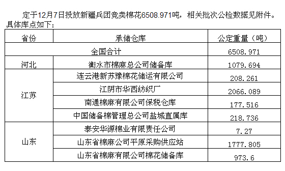 錦橋紡織網(wǎng)—資訊頻道> 棉花信息> 拋儲(chǔ)>正文 12月7日兵團(tuán)棉花競(jìng)賣預(yù)告:計(jì)劃投放6509噸