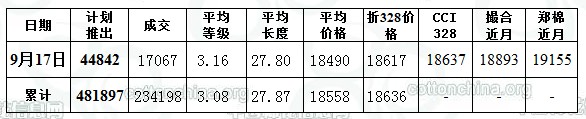9月17日儲(chǔ)備棉投放數(shù)量為44841.71噸,實(shí)際成交17066.91噸,成交比例38.06%,較前一交易日成交增加8179.15噸;當(dāng)日成交儲(chǔ)備棉平均等級(jí)為3.16,較前一交易日上升0.11級(jí);平均長(zhǎng)度27.80,較前一交易下降0.10;加權(quán)成交價(jià)18490元/噸,折328級(jí)成交價(jià)為18617元/噸(公重),較前一交易日上漲57元/噸(公重),比當(dāng)日CCIndex328價(jià)格比低20元/噸;較當(dāng)日撮合近月價(jià)格低276元/噸。截止到17日儲(chǔ)備棉投放已累計(jì)成交234198噸,累計(jì)成交比例48.60%,平均等級(jí)3.08,平均長(zhǎng)度27.87,平均加權(quán)價(jià)18558元/噸,折328級(jí)成交價(jià)18636元/噸。