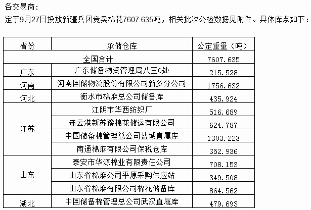 錦橋紡織網(wǎng)—資訊頻道> 棉花信息> 拋儲>正文 9月27日兵團棉花競賣預告:計劃投放7607.635噸