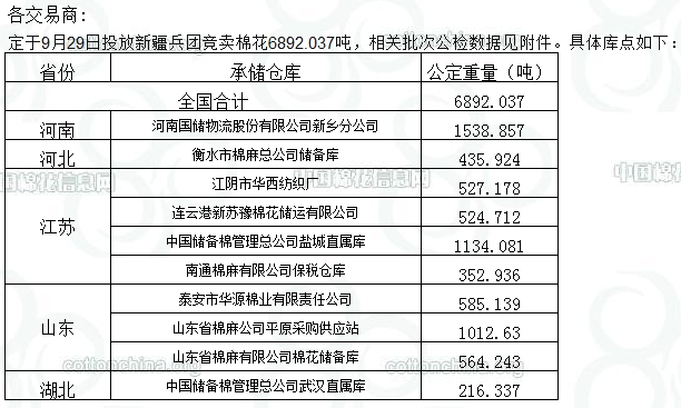 錦橋紡織網(wǎng)—資訊頻道> 棉花信息> 拋儲>正文 9月29日兵團(tuán)棉花競賣預(yù)告:計(jì)劃投放6892.037噸