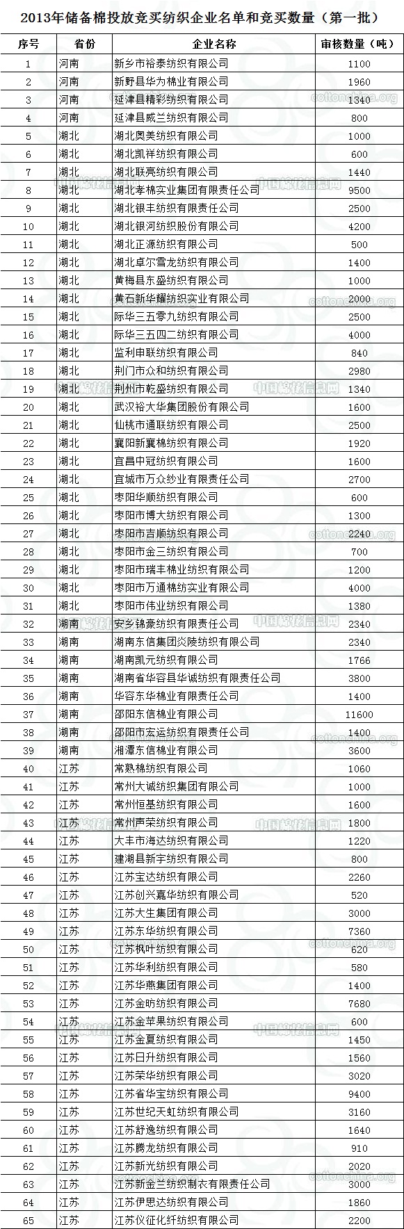 錦橋紡織網(wǎng)—資訊頻道> 棉花信息> 拋儲>正文 2013年儲備棉投放競買紡織企業(yè)名單和競買數(shù)量(第一批)