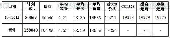1月16日儲(chǔ)備棉投放數(shù)量為80068.63噸,實(shí)際成交50940.09噸,成交比例63.62%;當(dāng)日成交儲(chǔ)備棉平均等級(jí)為4.31,較昨日平均等級(jí)高0.06;平均長(zhǎng)度28.39,較昨日平均長(zhǎng)度長(zhǎng)0.06;加權(quán)成交價(jià)18556元/噸,折328級(jí)成交價(jià)為19211元/噸(公重),比當(dāng)日CCIndex328價(jià)格比低62元/噸;較當(dāng)日撮合近月價(jià)格低68元/噸。截止1月16日,累計(jì)上市總量158039.91噸,累計(jì)成交總量104395.98噸,成交比例66.06%。