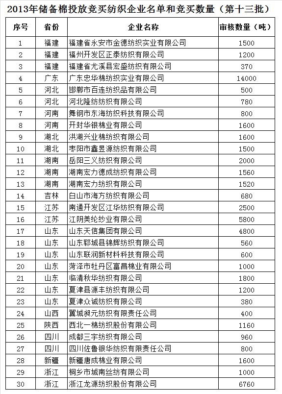 2013年儲備棉投放競買紡織企業(yè)名單和競買數量(第十三批)