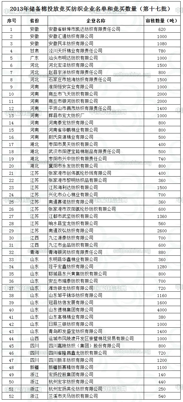 2013年儲備棉投放競買紡織企業(yè)名單和競買數(shù)量(第十七批)