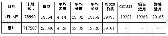 1月25日儲(chǔ)備棉投放數(shù)量為78990.17噸,實(shí)際成交18053.71噸,成交比例22.86%;當(dāng)日成交儲(chǔ)備棉平均等級(jí)為4.14,較昨日平均等級(jí)低0.10;平均長度28.02,較昨日平均長度低0.12;加權(quán)成交價(jià)18468元/噸,折328級(jí)成交價(jià)為19096元/噸(公重),比當(dāng)日CCIndex328價(jià)格比低185元/噸;較當(dāng)日撮合近月價(jià)格低172元/噸。截止1月25日,累計(jì)上市總量717507.19噸,累計(jì)成交總量291086.22噸,成交比例40.57%。