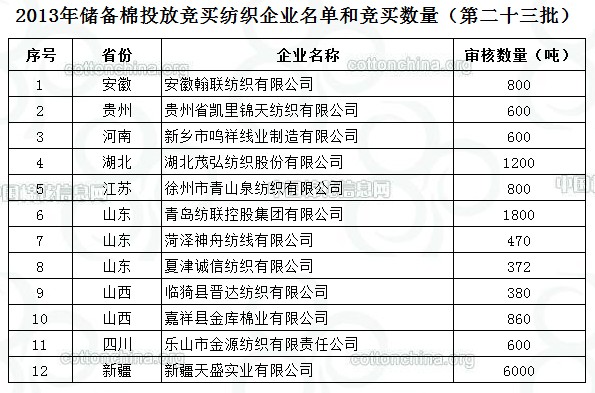 2013年儲(chǔ)備棉投放競(jìng)買紡織企業(yè)名單和競(jìng)買數(shù)量(第二十三批)