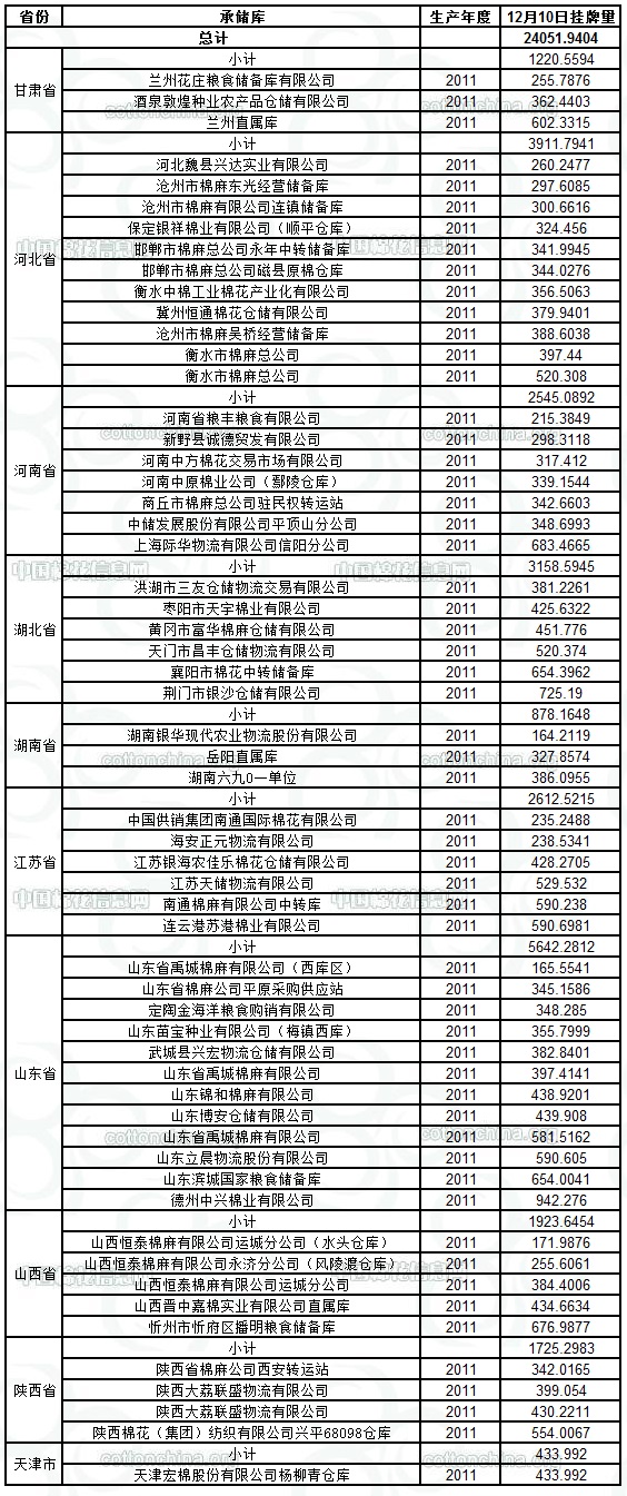 各紡織企業(yè): 定于12月10日出庫(kù)銷售儲(chǔ)備棉24051.9404噸。其中2011年度國(guó)產(chǎn)棉21277.0844噸,2011年度進(jìn)口棉2774.8560噸。相關(guān)批次公檢數(shù)據(jù)見(jiàn)附件。具體庫(kù)點(diǎn)如下: