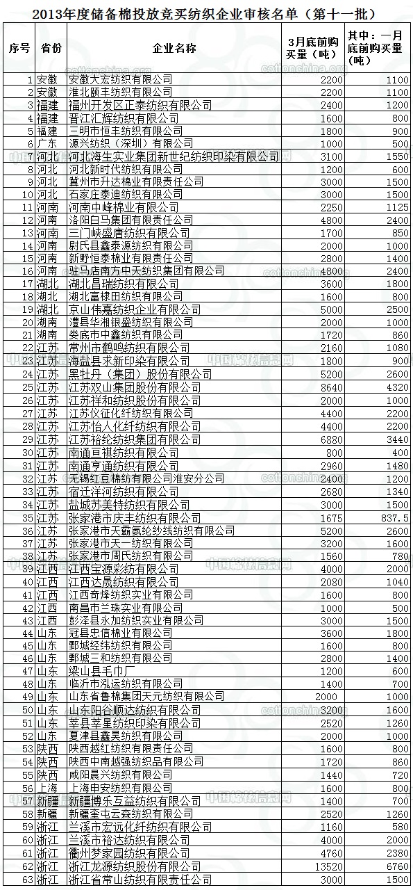 錦橋紡織網(wǎng)—資訊頻道> 棉花信息> 拋儲(chǔ)>正文 2013年度儲(chǔ)備棉投放競(jìng)買(mǎi)紡織企業(yè)審核名單(第十一批)