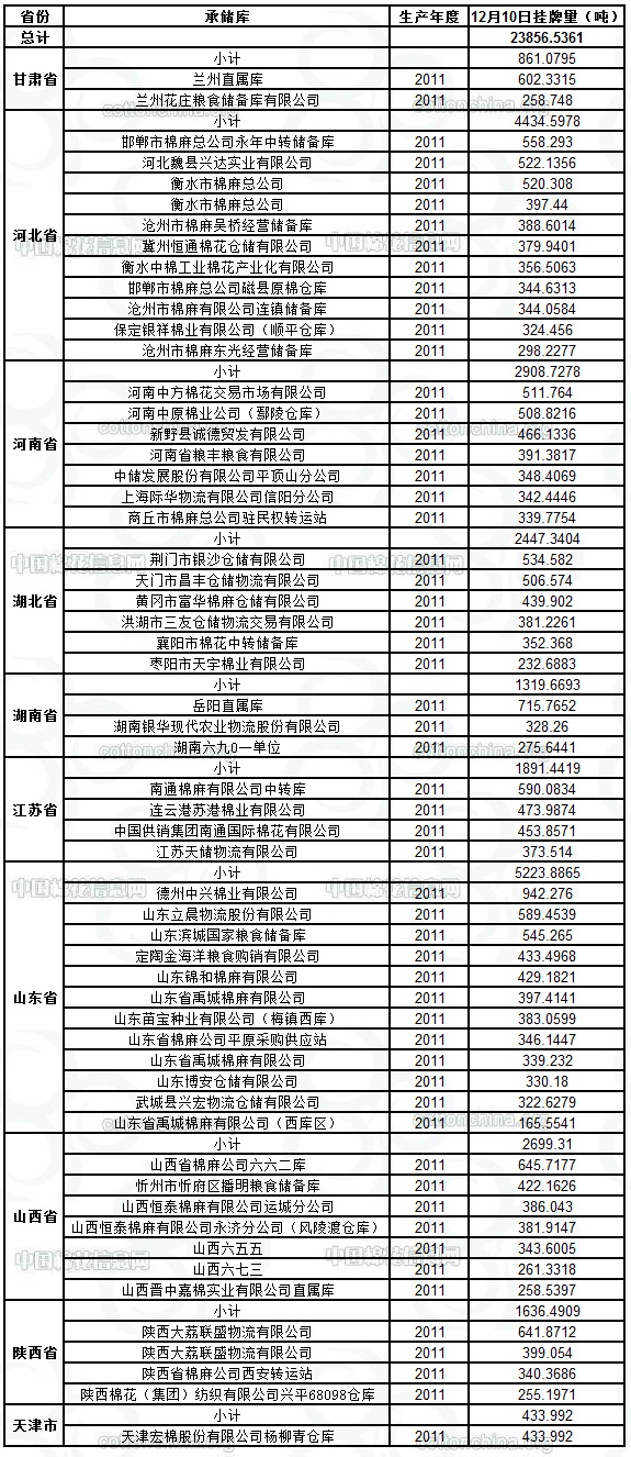 各紡織企業(yè): 定于12月12日出庫銷售儲備棉23856.5361噸。其中2011年度國產(chǎn)棉21375.6403噸,2011年度進(jìn)口棉2480.8958噸。相關(guān)批次公檢數(shù)據(jù)見附件。具體庫點如下: