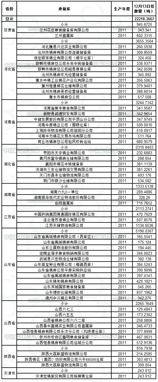 定于12月13日出庫銷售儲備棉22218.3667噸。其中2011年度國產(chǎn)棉19910.6476噸,2011年度進口棉2307.7191噸。相關(guān)批次公檢數(shù)據(jù)見附件。具體庫點如下:
