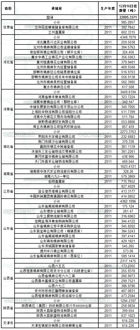 各紡織企業(yè): 定于12月16日出庫銷售儲(chǔ)備棉22095.3371噸。其中2011年度國產(chǎn)棉20951.2379噸,2011年度進(jìn)口棉1144.0992噸。相關(guān)批次公檢數(shù)據(jù)見附件。具體庫點(diǎn)如下: