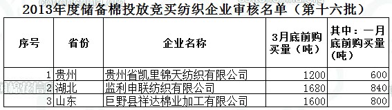 2013年度儲(chǔ)備棉投放競(jìng)買紡織企業(yè)審核名單(第十六批)