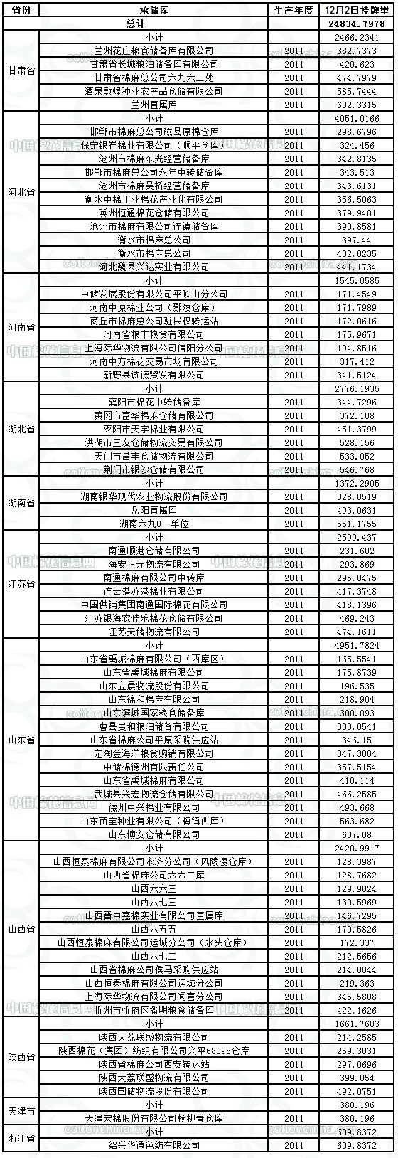 各紡織企業(yè): 定于12月2日出庫(kù)銷(xiāo)售儲(chǔ)備棉24834.7978噸。其中2011年度國(guó)產(chǎn)棉21540.7162噸,2011年度進(jìn)口棉3294.0816噸。相關(guān)批次公檢數(shù)據(jù)見(jiàn)附件。具體庫(kù)點(diǎn)如下: