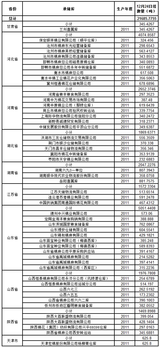 各紡織企業(yè): 定于12月24日出庫銷售儲備棉21685.7755噸。其中2011年度國產(chǎn)棉19523.6058噸,2011年度進口棉2162.1697噸。相關(guān)批次公檢數(shù)據(jù)見附件。具體庫點如下: