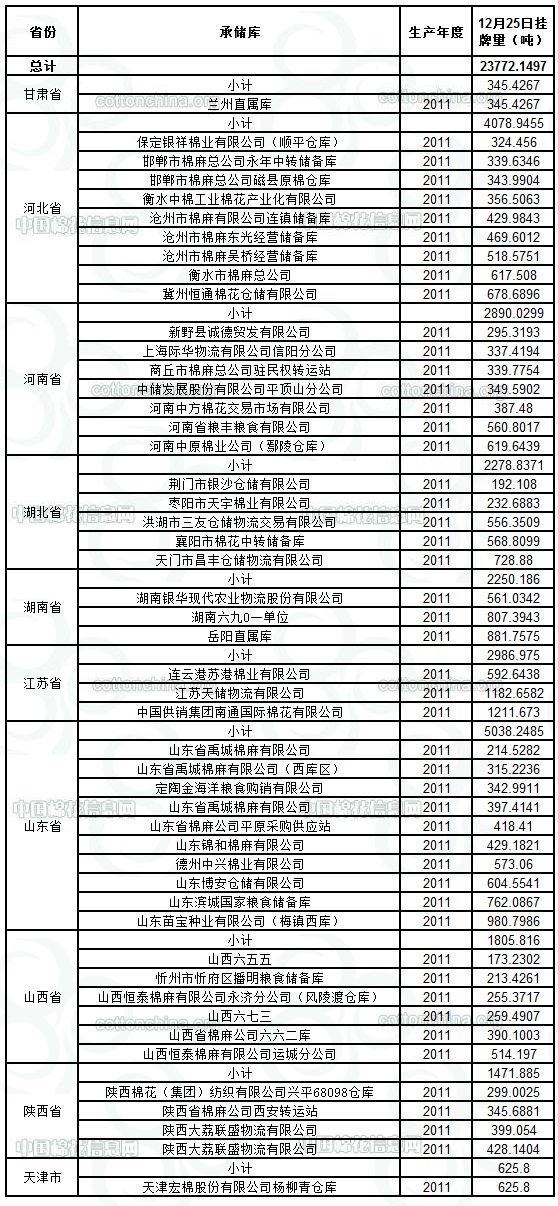 各紡織企業(yè): 定于12月25日出庫銷售儲備棉23772.1497噸。其中2011年度國產(chǎn)棉19804.3761噸,2011年度進口棉3967.7736噸。相關(guān)批次公檢數(shù)據(jù)見附件。具體庫點如下: