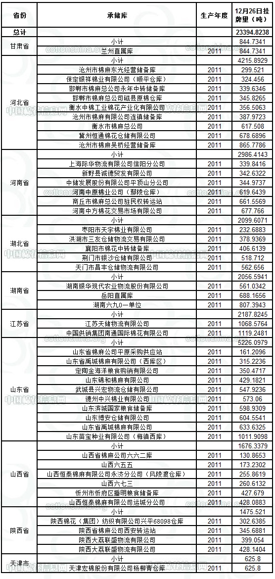 各紡織企業(yè): 定于12月26日出庫銷售儲備棉23394.8238噸。其中2011年度國產(chǎn)棉20195.0895噸,2011年度進口棉3199.7343噸。相關批次公檢數(shù)據(jù)見附件。具體庫點如下: