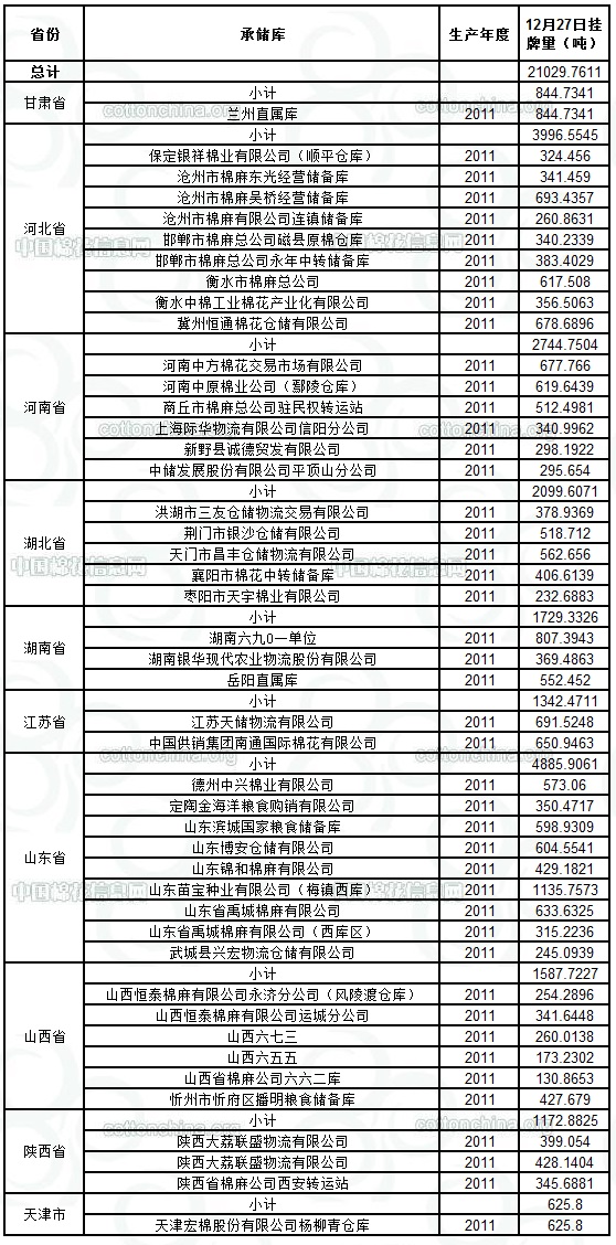 定于12月27日出庫銷售儲備棉21029.7611噸。其中2011年度國產(chǎn)棉18551.5327噸,2011年度進口棉2478.2284噸。相關批次公檢數(shù)據(jù)見附件。具體庫點如下: