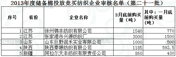 2013年度儲備棉投放競買紡織企業(yè)審核名單(第二十一批)