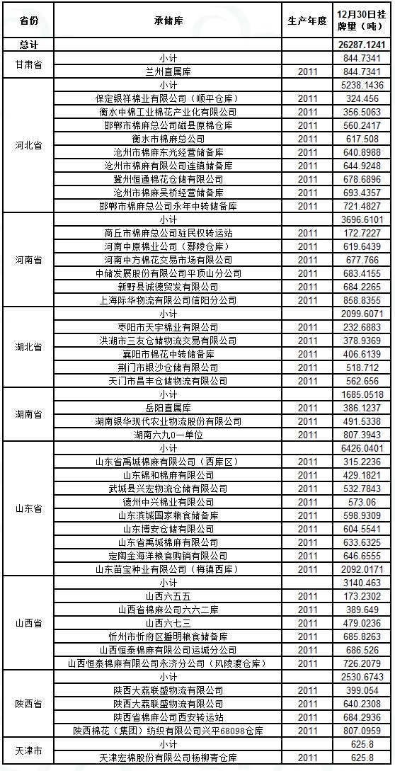 各紡織企業(yè): 定于12月30日出庫(kù)銷(xiāo)售儲(chǔ)備棉26287.1241噸。其中2011年度國(guó)產(chǎn)棉24195.107噸,2011年度進(jìn)口棉2092.0171噸。相關(guān)批次公檢數(shù)據(jù)見(jiàn)附件。具體庫(kù)點(diǎn)如下: