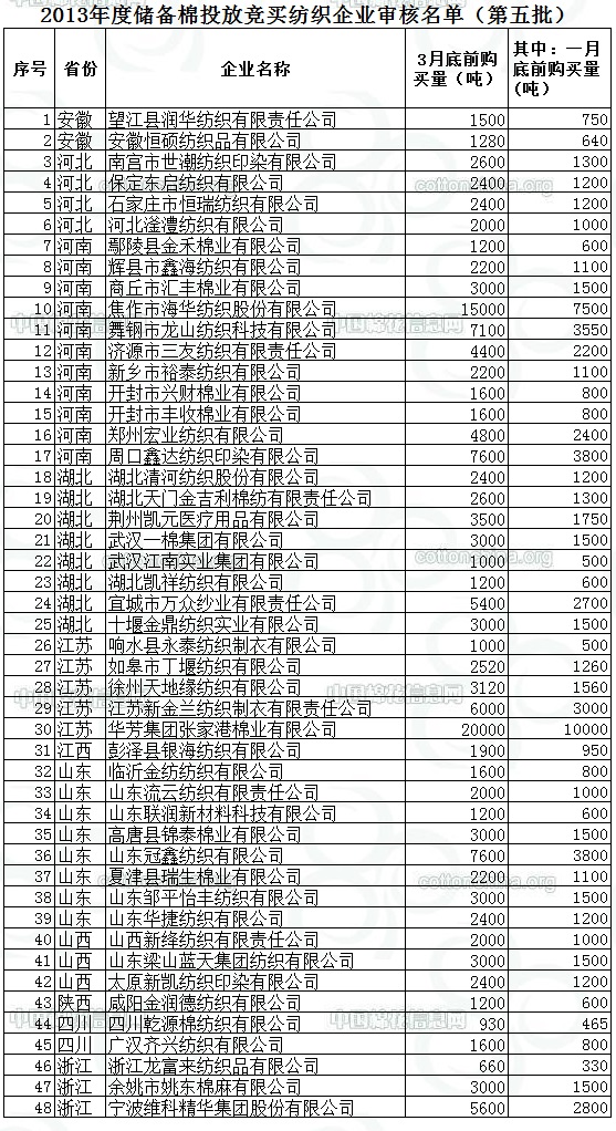 2013年度儲(chǔ)備棉投放競(jìng)買紡織企業(yè)審核名單(第五批)