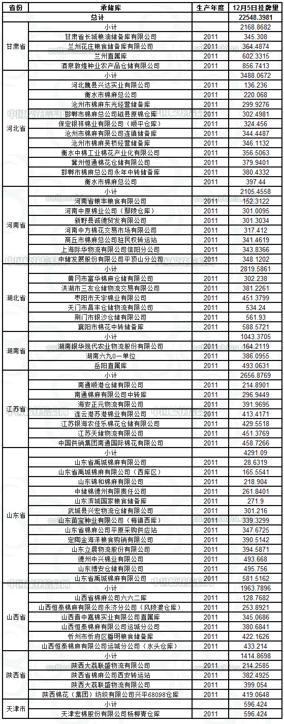 定于12月5日出庫銷售儲(chǔ)備棉22548.3981噸。其中2011年度國產(chǎn)棉19664.6458噸,2011年度進(jìn)口棉2883.7523噸。相關(guān)批次公檢數(shù)據(jù)見附件。具體庫點(diǎn)如下: