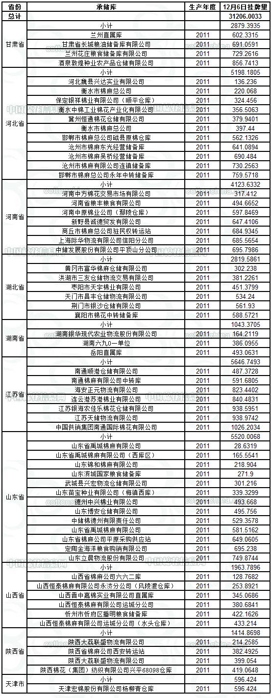 各紡織企業(yè): 定于12月6日出庫銷售儲備棉31206.0033噸。其中2011年度國產(chǎn)棉25218.6169噸,2011年度進(jìn)口棉5987.3864噸。相關(guān)批次公檢數(shù)據(jù)見附件。具體庫點如下: