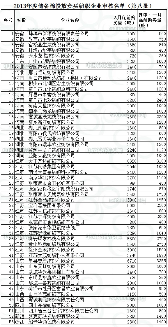 2013年度儲(chǔ)備棉投放競(jìng)買紡織企業(yè)審核名單(第八批)